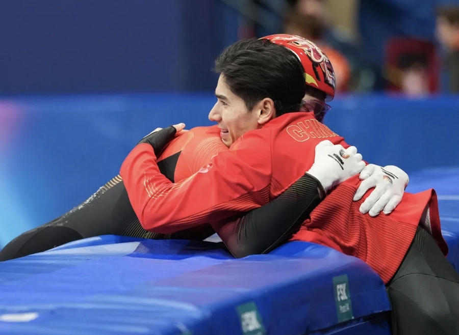 短说念速滑男人1000米A组决赛,中国选手孙龙在终末时刻告捷摘银,为中国短说念速滑队赢得本届冬奥会首枚奖牌。冲过绝顶线时,由于要点不稳,孙龙摔出赛说念。站在场边的队友刘少昂飞速冲过来稽查情况,随后隔着围栏与孙龙拥抱庆祝……